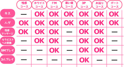 基本プレイ‥キス、ハグ、指を使った性感帯への愛撫、リップを使った性感帯への愛撫。